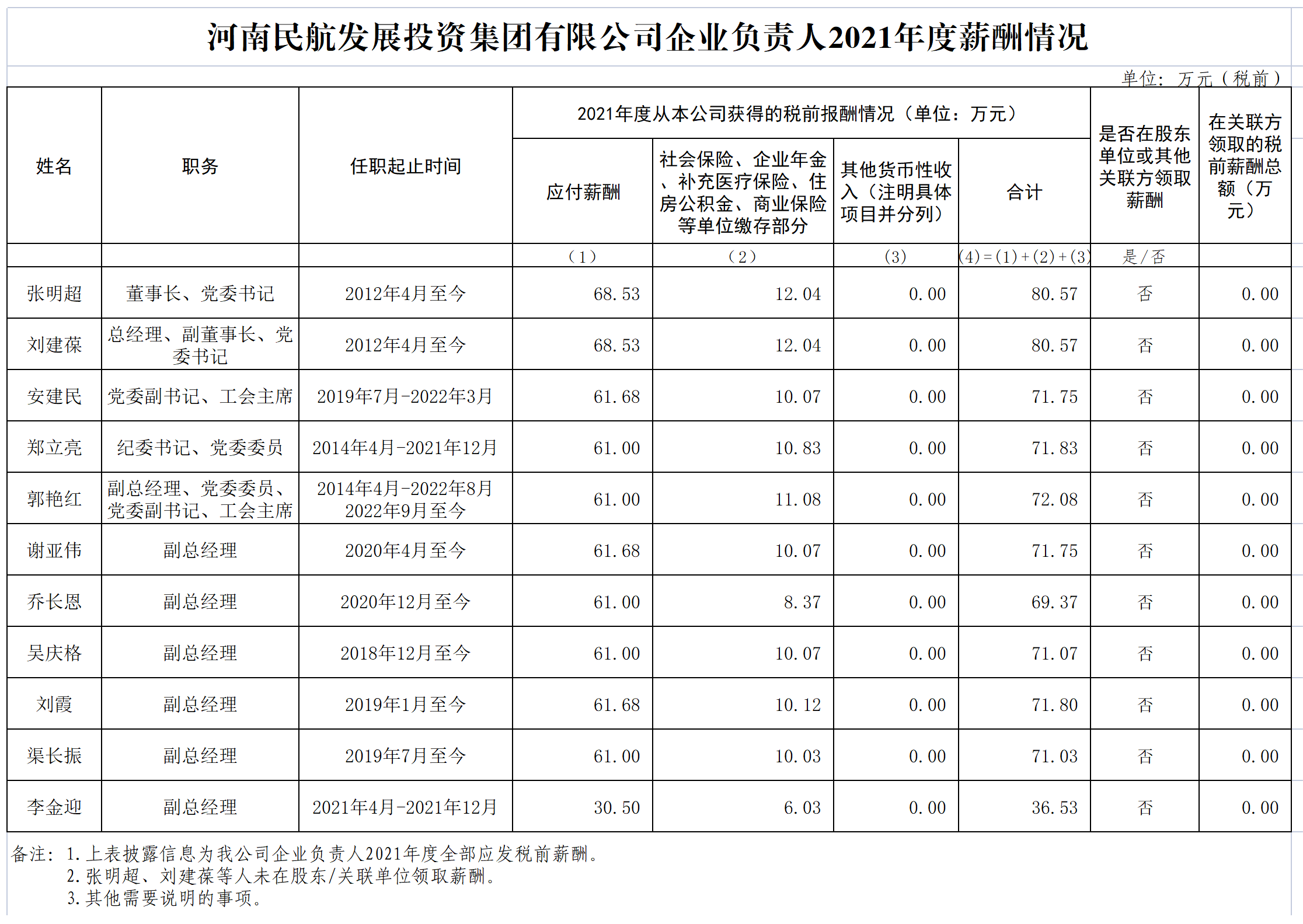 河南民航發(fā)展投資集團有限公司企業(yè)負責人2021年度薪酬情況