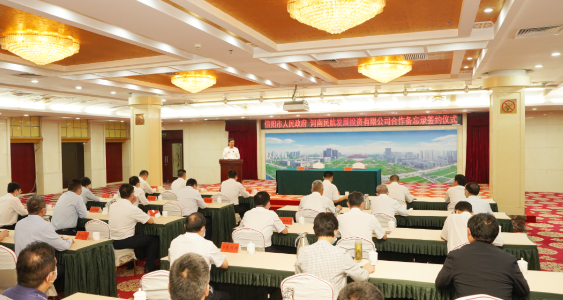 9月10日,河南民航發(fā)展投資有限公司與信陽市人民政府在信陽市行政中心簽約,以項(xiàng)目為抓手,就發(fā)展航空產(chǎn)業(yè)、推動(dòng)信陽革命老區(qū)振興展開全面合作。信陽市委書記王東偉,市委副書記、市長(zhǎng)蔡松濤,河南航投黨委書記、董事長(zhǎng)張明超,總經(jīng)理、黨委副書記、副董事長(zhǎng)劉建葆,以及信陽市委常委、市委秘書長(zhǎng)楊進(jìn),副市長(zhǎng)呂旅,市政府秘書長(zhǎng)張全勝,河南航投副總經(jīng)理謝亞偉、喬長(zhǎng)恩參加儀式。雙方在簽約前進(jìn)行了座談,張明超與蔡松濤在儀式上分別致辭。