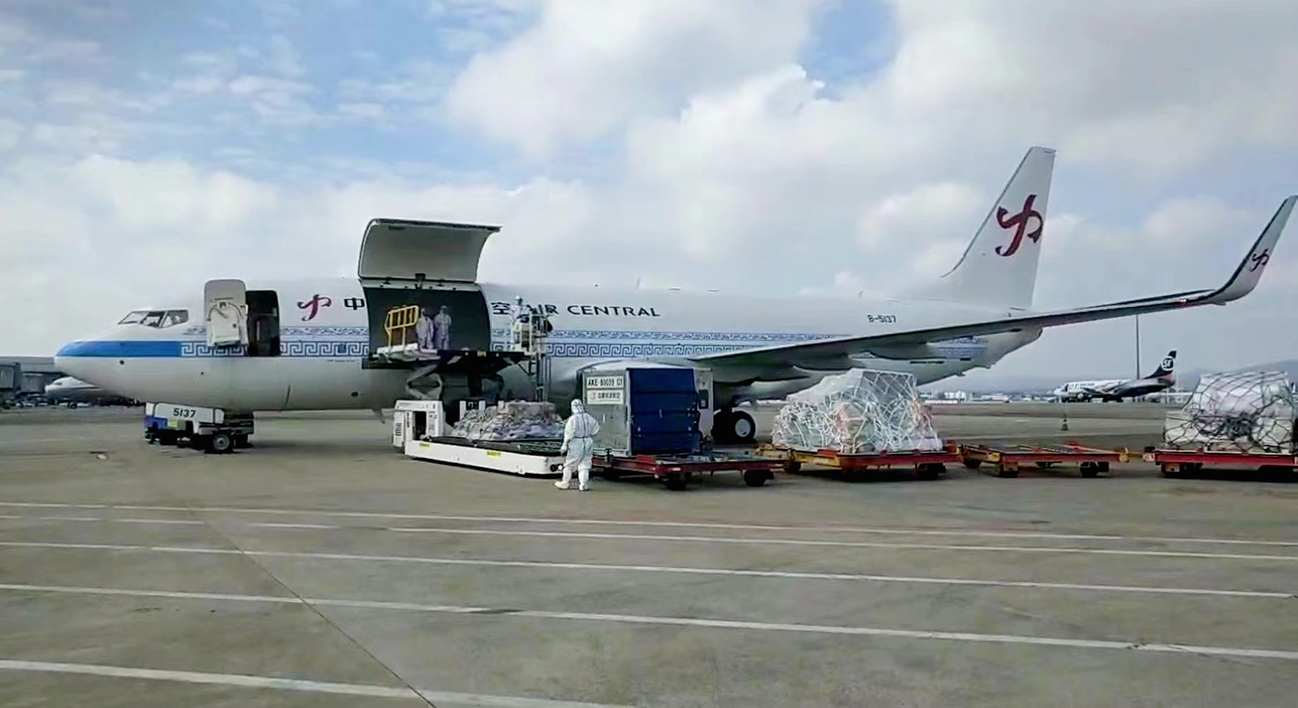 11月11日12時41分,中原龍浩航空一架滿載紡織輔料、工程配件等貨物的波音737-800全貨機從南寧吳圩國際機場順利起飛,尾翼上“中”字形Logo熠熠生輝,當日15時許抵達越南胡志明市,標志著中原龍浩航空又一條通往RCEP重要城市的國際貨運航線正式開通,這也是中原龍浩航空新涂裝貨機的首次亮相。