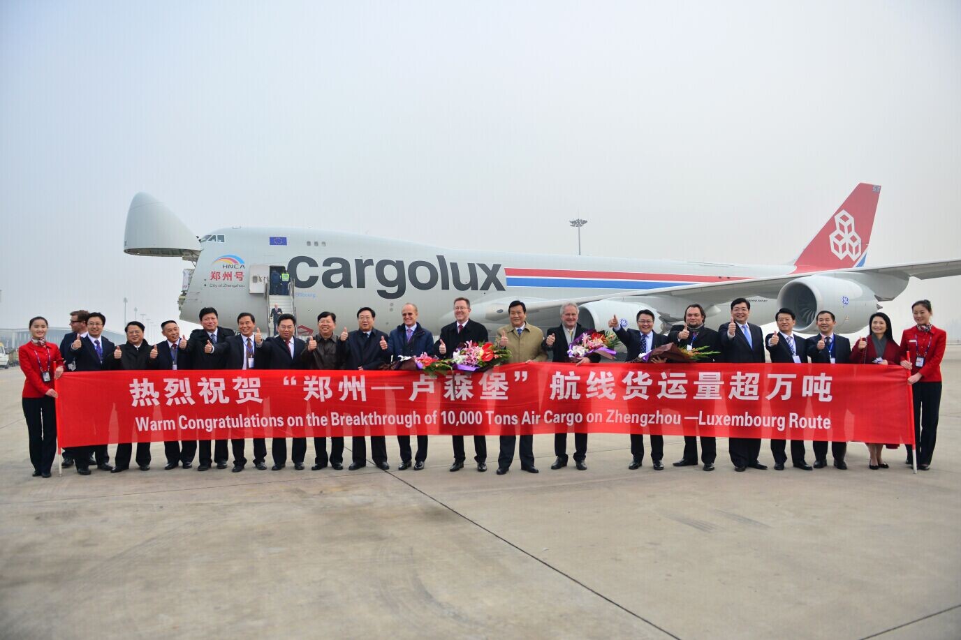 為慶祝洲際新航線的喜人佳績,鄭、盧兩地均舉行了簡單而熱烈的紀念活動。當地時間22日下午5點,在芬德爾機場舉行了“貨運超萬噸航班起航儀式”,盧森堡可持續發展與基礎產業部部長弗朗索瓦?鮑施、中國駐盧森堡大使曾憲柒以及盧貨航董事會主席保羅?海明格、CEO德克?李奇、高級副總裁兼財務總監理查德?福森參加。之后,保羅?海明格、德克?李奇、理查德?福森特意搭乘“鄭州號”飛抵鄭州,參加中方23日下午舉行的“貨運超萬噸航班接機儀式”。