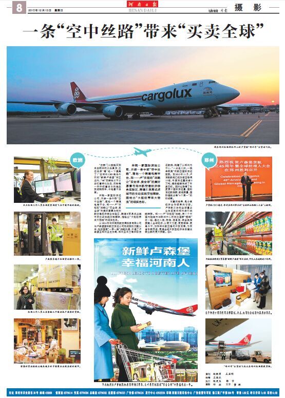 在8次報道中,既有會前的“熱身”宣傳,又有會中的集中點擊,還有會后的回顧追蹤,形成系列,精彩紛呈。13日,《河南日報》以圖文并茂的整版篇幅,對河南航投與盧貨航的合作,尤其是“新鮮盧森堡”雙向跨境E貿易進行了詳細報道。整個報道以新聞攝影為主,既有盧貨航“鄭州號”波音747-8F全貨機,也有鄭-盧航線的專業操作流程展示,還有河南百姓采購“新鮮盧森堡”商品的真實場景……以鄭盧“雙樞紐”為典型案例,圍繞“一條‘空中絲路’帶來‘買賣全球’”這一主題,生動展現了河南省依靠藍天對外開放的新思路和新成就。