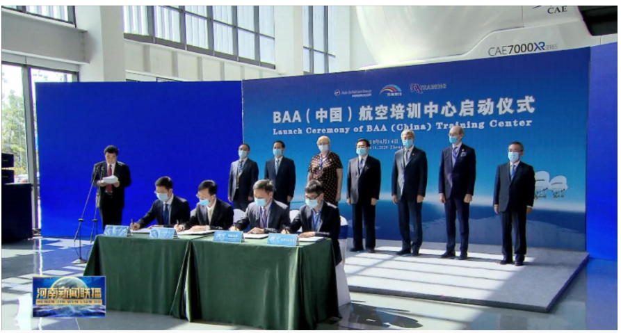 在BAA(中國)航空培訓中心啟動儀式上,河南航投與法國SIMAREO、中國南航、安陽工學院等簽署合作備忘錄,與會嘉賓觀看了模擬飛行器運行。