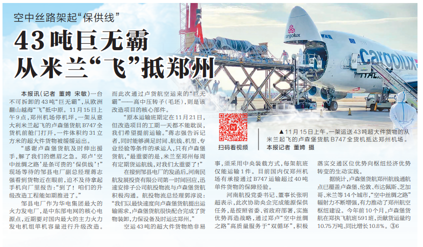 本報訊(記者 董娉 宋敏)一臺不可拆卸的43噸“巨無霸”,從歐洲翻山越海“飛”抵中原。11月15日上午9點,鄭州機場停機坪,一架從意大利米蘭起飛的盧森堡貨航B747全貨機前艙門打開,一件體積約31立方米的超大件貨物被緩緩運出。